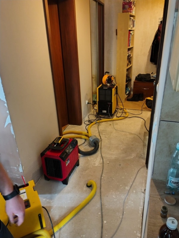 Jeśli woda znajduje się pod panelami, pod płytkami, w warstwach posadzki, zwykłe osuszanie powietrza w pokoju nie rozwiąże problemu. Wtedy stosuje się osuszanie podposadzkowe – i to jest jeden z najczęstszych przypadków po awarii instalacji w budynku.